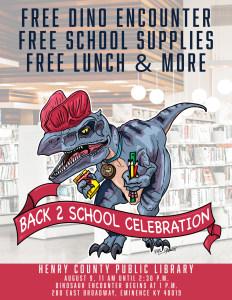 Join us at the library for our fourth annual Back 2 School Celebration. At this all day event friends and community partners will be on hand with free school supplies to pick up and the library will have special back to school activities for all ages. Lunch will be provided by Kiwanis Club of Henry County while supplies last.