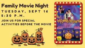 Celebrate Halloween at a retro Family Movie Night. We’ll be watching a 1998 classic about a young witch who must save her peaceful town from an invading dark force. Special Halloween crafts and 90s candy will also be available. Snacks are provided by the library, and all ages are welcome. Activities will begin at 5 p.m. and the movie will begin at 5:30 p.m.