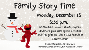 December’s Family Story Time will feature both winter fun and building healthy habits around media. Each family will receive a storybook featuring Sesame Street characters, a family guide, activity pages, stickers, and more from Sesame Street’s Raising Kids in a Digital World Program.