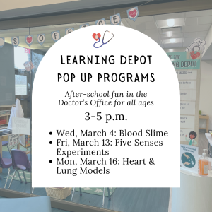 Learn how our heart and lungs work and how we can take care of them by building 3D models and completing fun science experiments. Meet us in the Doctor’s Office Learning Depot to explore, learn, and grow.
