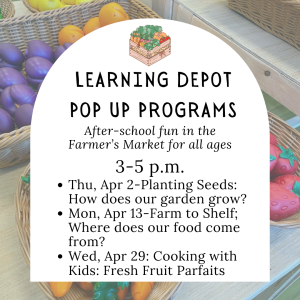 Children of all ages are welcome to join us in the Farmer’s Market Learning Depot for an extra-special project. Stop by to make a fruit parfait and try some fresh fruits and veggies grown by local farmers.