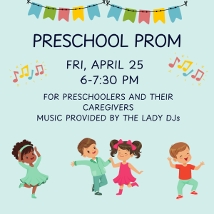 We are excited to host our first Preschool Prom at the library! Any child who has not started Kindergarten yet, and their caregivers, are invited to attend. Music will be provided by The Lady DJs. Snacks and special activities will be provided by the library and community partners.